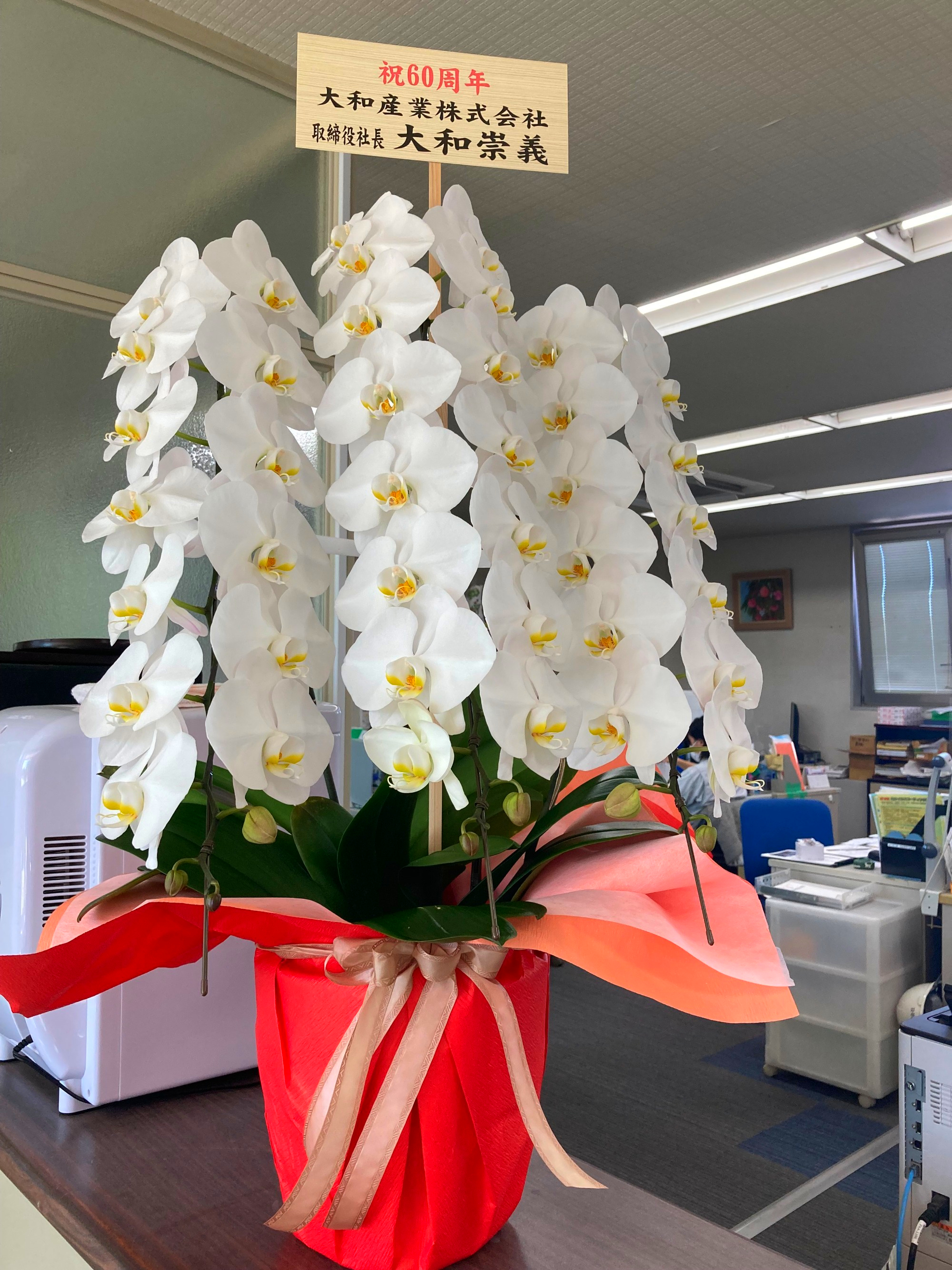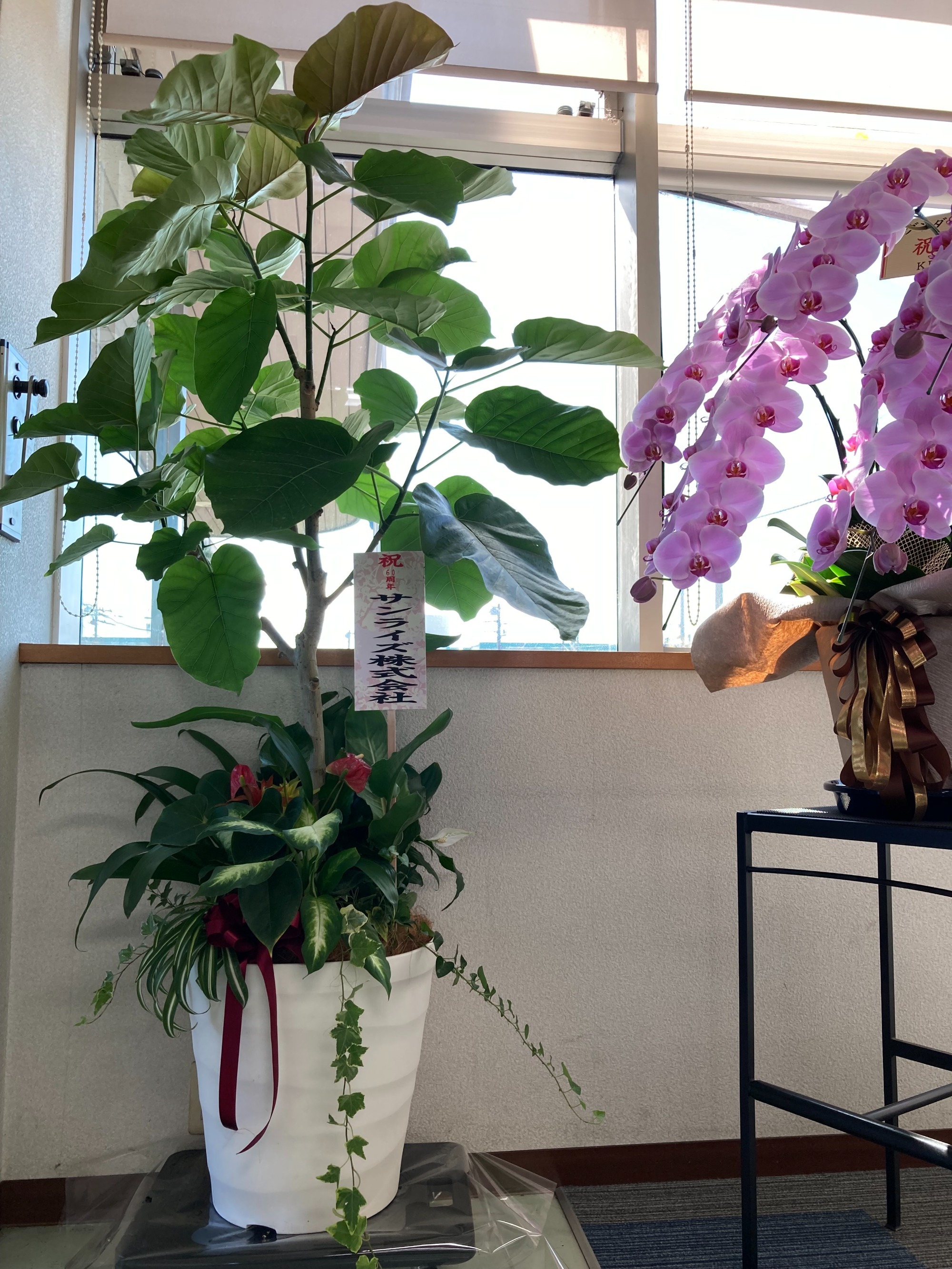 お取引先様より60周年のお祝いでたくさんのお花や記念品をいただきました。有難うございます。